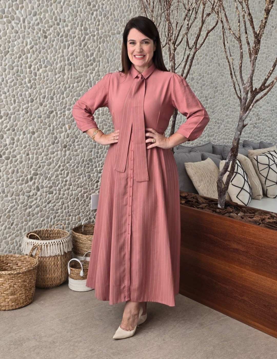 Vestido longo tecido encorpado estruturado forrado mangas 3/4 acompanha faixa